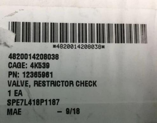 M1150 ABV, M88 ARV 12365961 AUTOMATIC RESTRICTOR CHECK VALVE RH 4820-01-420-8038
