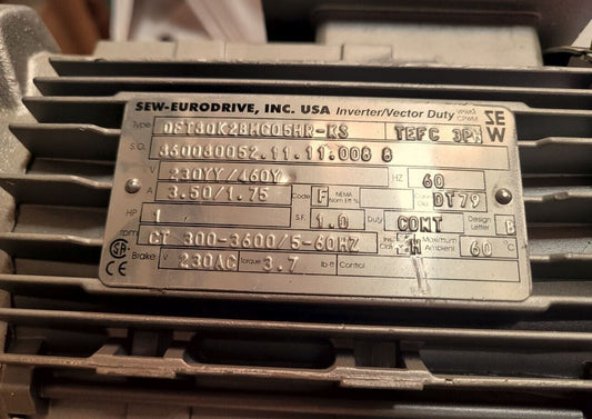 SEW EURODRIVE 1 HP GEAR MOTOR 230YY/460Y DFT80K2-KS 60hz 2BMG05HR tefc 3pw